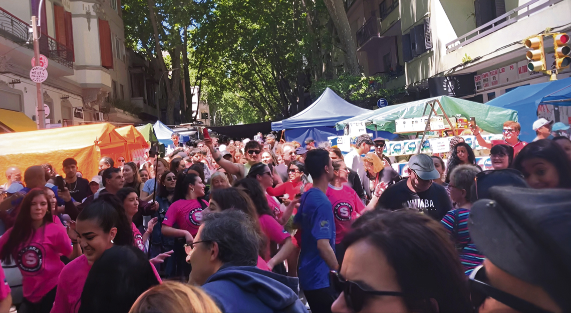 Alfonso tomó una decisión inédita, por el tamaño (cuarenta personas entre bailarinas y la cuerda de tambores) de ir bailando y tocando entre la gente hasta llegar al puesto de Ariel Mendoza, nuestro amigo común fallecido recientemente, a quien este aniversario está dedicado. Allí, frente a su puesto, realizaron el típico corte de tambores ante la emoción de su esposa. Se paralizó la feria por unos minutos para escuchar el toque emotivo y sentir cómo la música se convertía en abrazo, en homenaje, en memoria viva.