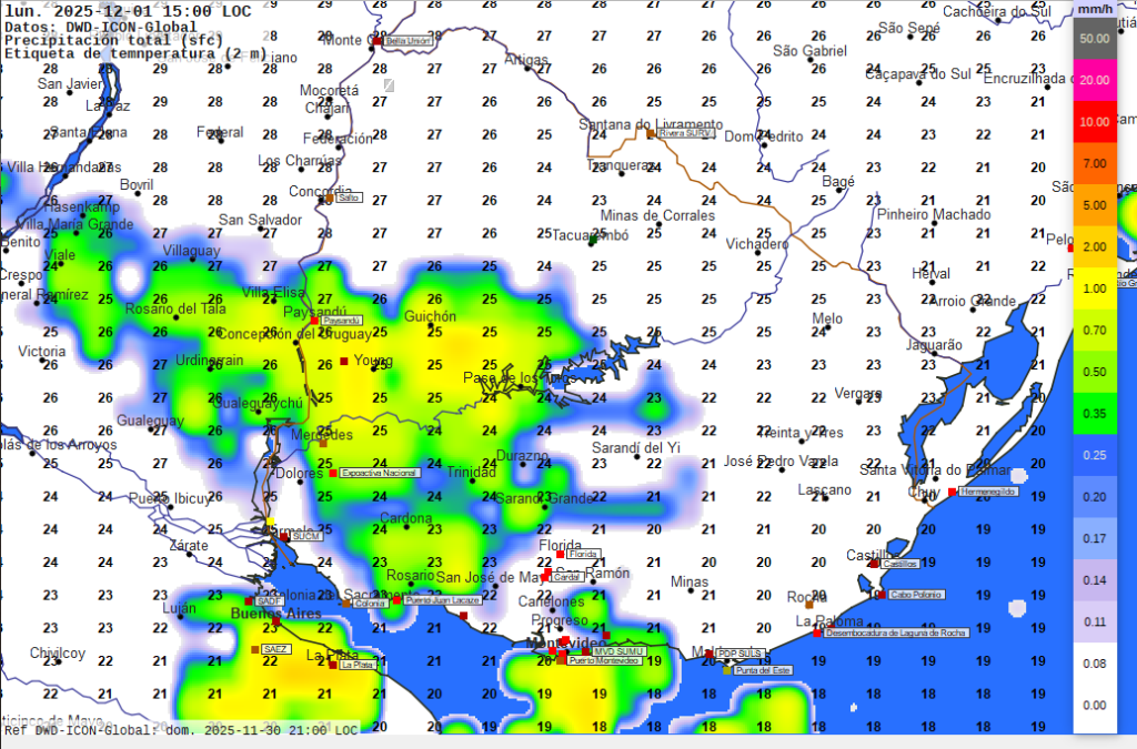 Imagen 1. Mapa pronosticado para las 15 horas del lunes. Temperaturas en grados Celsius previstas a 2 metros de altura según valores numéricos. Intensidad de las  precipitaciones pronosticadas en milímetros por hora según escala de colores a la derecha.
