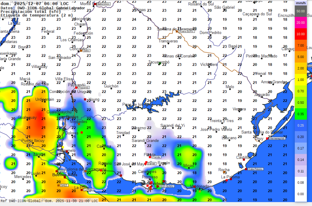 Imagen 8 Mapa pronosticado para las 06 horas de la mañana del sábado­. Temperaturas en grados Celsius previstas a 2 metros de altura según valores numéricos.  Intensidad de las precipitaciones pronosticadas en milímetros por hora según escala de colores a la derecha.