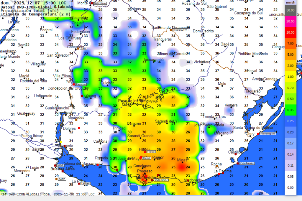 Imagen 11 Mapa pronosticado para las 15 horas de la tarde del domingo­. Temperaturas en grados Celsius previstas a 2 metros de altura según valores numéricos.  Intensidad de las precipitaciones pronosticadas en milímetros por hora según escala de colores a la derecha.