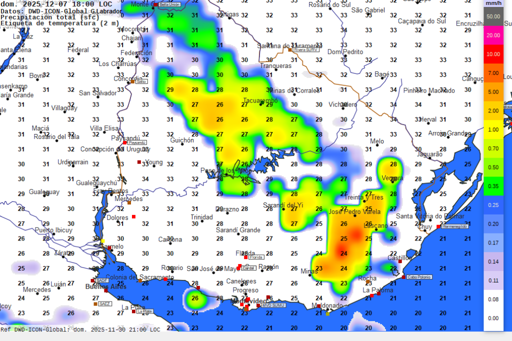 Imagen 12 Mapa pronosticado para las 18 horas de la tarde del domingo­. Temperaturas en grados Celsius previstas a 2 metros de altura según valores numéricos.  Intensidad de las precipitaciones pronosticadas en milímetros por hora según escala de colores a la derecha.