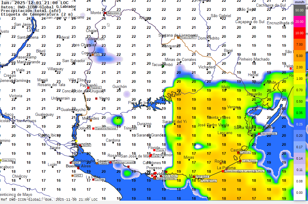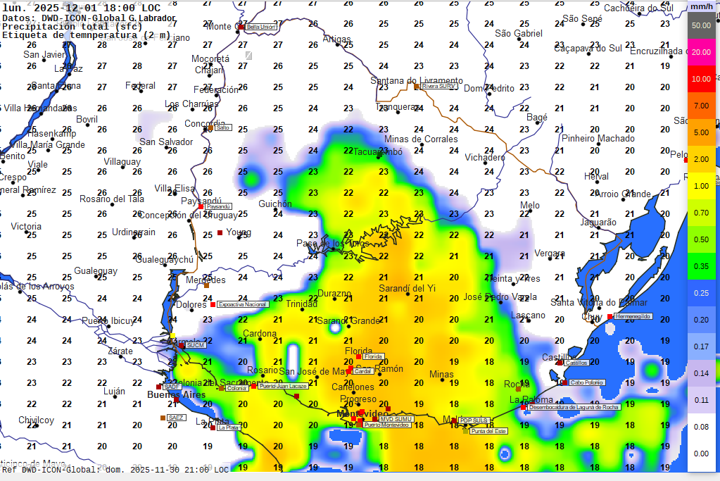 Imagen 2. Mapa pronosticado para las 18 horas del lunes. Temperaturas en grados Celsius previstas a 2 metros de altura según valores numéricos.  Intensidad de las precipitaciones pronosticadas en milímetros por hora según escala de colores a la derecha.