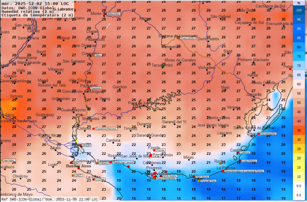 Imagen 4 Mapa pronosticado para las 15 horas de la tarde del martes . Temperaturas previstas en  grados Celsius según valores numéricos. Humedad relativa ambiente en porcentaje según escala de colores a la derecha de la imagen.