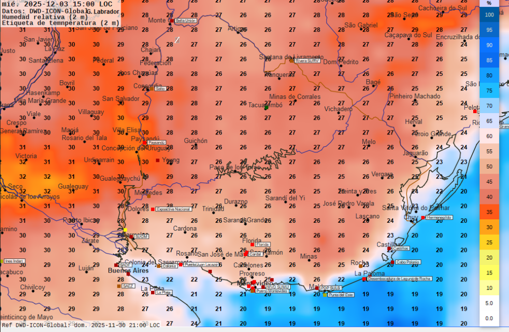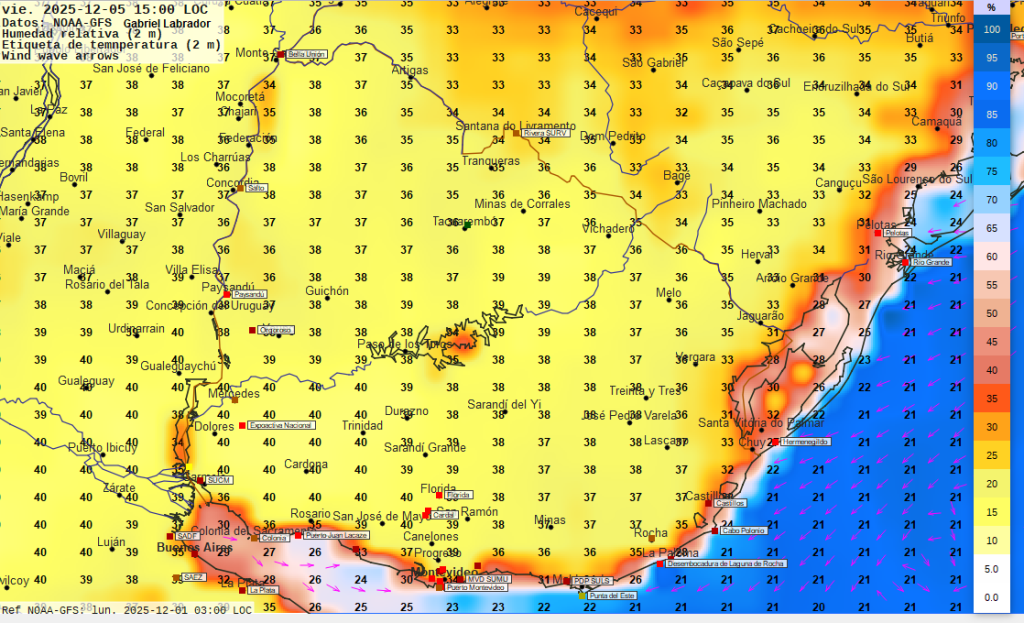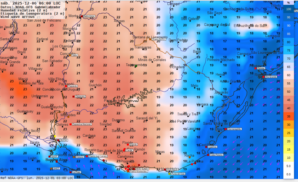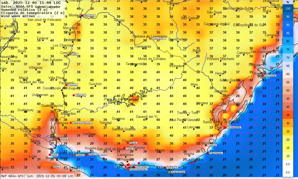 Procesamiento y análisis  meteorológico efectuado con datos de NOAA (Administración Nacional  de los  Océanos y la Atmósfera, modelo GFS); datos y software de NASA (Administración Nacional de la Aeronáutica y el Espacio); datos del servicio meteorológico alemán (modelo ICON); datos del servicio meteorológico francés Meteo-France (modelo Arpege) y del Centro Europeo de Predicción del Tiempo y el Clima. Los modelos de predicción meteorológica actualizan datos por lo menos dos veces diarias, por lo que a efectos de ponderar la información se debe considerar que pueden variar los resultados de predicción en el transcurso de los días siguientes a su emisión. Los datos, productos e imágenes disponibles están destinados únicamente a fines informativos. Información NO oficial. Ni el sitio web ni los datos que se muestran en esta página se consideran con fines operativos y no deben utilizarse para respaldar la toma de decisiones, el pronóstico, las emergencias u otras operaciones de mitigación o respuesta a desastres, ya sean públicas o privadas. La responsabilidad sobre alertas o advertencias o avisos a la población recae únicamente en los servicios públicos debidamente autorizados. “Corresponde a los servicios meteorológicos oficiales mantener el nivel de información pronósticos y advertencias adecuado”  Se da estricto cumplimiento a la Ley 19.158 ARTÍCULO 4: “Todos los medios de difusión e información oral, televisiva o escrita, Información telefónica, electrónica o cualquier otro medio de difusión masiva, que emitan información meteorológica dentro del territorio de la República, deberán señalar la fuente de dicha Información. La reglamentación que dicte el Poder Ejecutivo establecerá las sanciones a aplicar en caso de incumplimiento.”