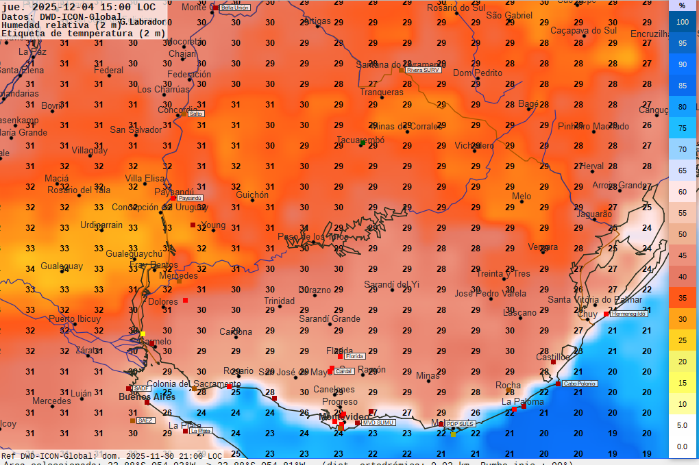 Imagen 6 Mapa pronosticado para las 15 horas de la tarde del jueves. Temperaturas en  grados Celsius según valores numéricos. Humedad relativa ambiente en porcentaje según escala de colores a la derecha de la imagen.