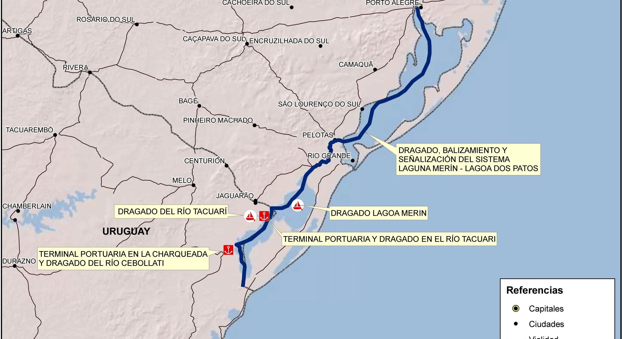 Se supo estos días que nuestro vecino norteño se abrió –una vez más– un nuevo llamado a licitación para realizar obras de dragado y balizamiento en el área de la proyectada Hidrovía Uruguay-Brasil, o sea laguna Merín ambas márgenes, canal San Gonzalo y Laguna de los Patos en el Brasil, uniendo costas uruguayas con puertos brasileños en Río Grande del Sur: Pelotas, Río Grande, Porto Alegre entre otros.