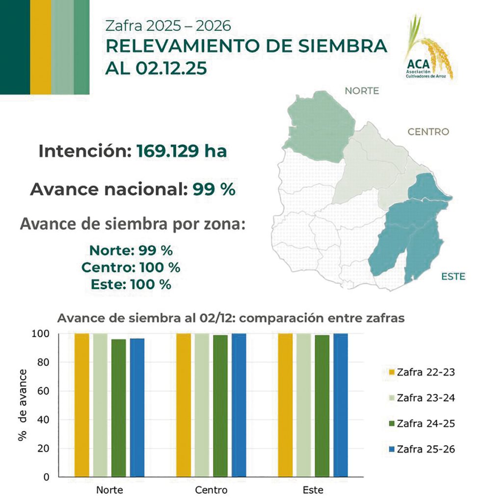 La intención de siembra alcanza las 169.129 hectáreas y el avance nacional asciende al 99%. Las zonas Centro (Rivera, Tacuarembó y parte centro oeste de Cerro Largo) y Este (Treinta y Tres, Rocha, Lavalleja y parte este de Cerro Largo) ya se encuentran completamente implantadas, mientras que la zona Norte (Artigas y Salto) registra un avance del 99%, manteniendo aún una pequeña proporción de área pendiente debido a la humedad del suelo, ocasionada por las precipitaciones recientes.