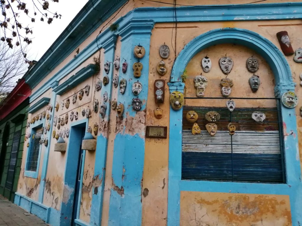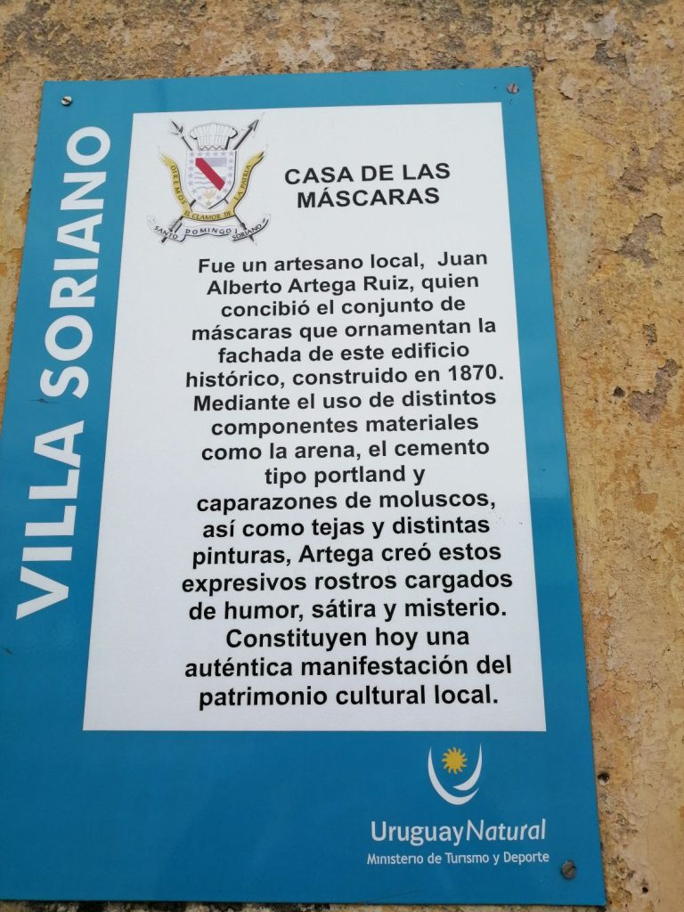 A pocas cuadras, sobre la esquina de Cabildo e Ituzaingó, se encuentra la Casa de las Máscaras, una de las expresiones más singulares del arte popular del litoral. La vivienda fue intervenida por Juan Alberto Artega Ruiz, “Don Paco”, albañil y artista autodidacta nacido en la villa en 1910. A lo largo de su vida creó cientos de máscaras de cemento, decoradas con conchillas, piedras y otros elementos naturales, cuyas expresiones reflejaban sus estados de ánimo. Hoy, la casa —cuidada por su familia— conserva ese legado como parte viva de la identidad cultural de Villa Soriano.